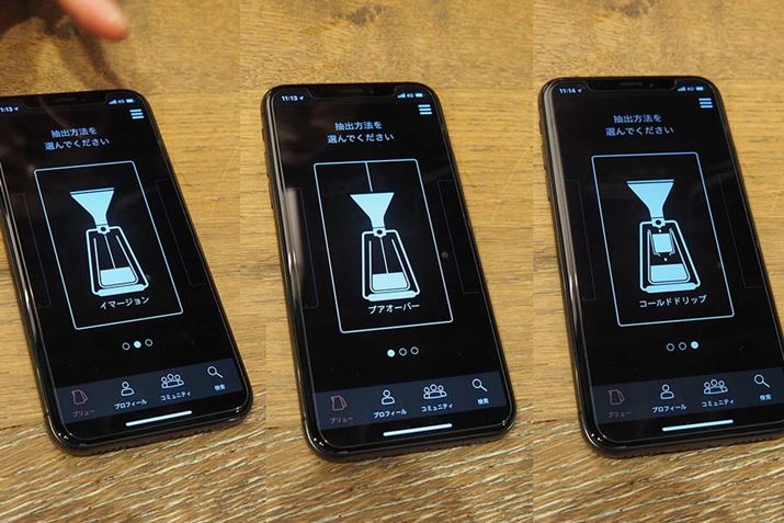 GINAで選べる抽出方法3種類。一般的なプアオーバー(中央)のほか、イマージョン(左)やコールドドリップ(右)も選べます