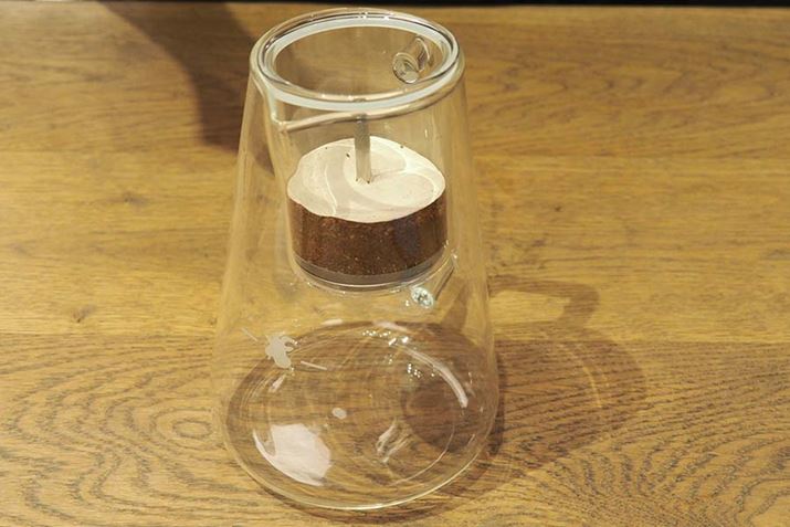 コールドドリップには付属する「コールドドリップグラス」を使います。コールドドリップグラスにコーヒー粉を入れて専用フィルターを乗せたら、グラスをプアオーバーにも使用したサーバーにセットします