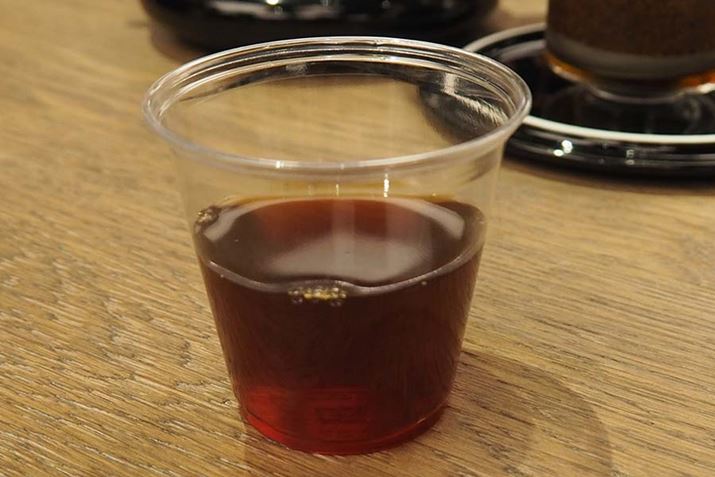 コールドドリップされたコーヒー。豆は最初に試飲したエチオピアと同じものですが、透明度が格段に高いのがわかります。また、色もコーヒーの色としては赤味を帯びているのが特徴的。味はコーヒーの苦みが少なく、限りなく「旨み」を強調したイメージでした