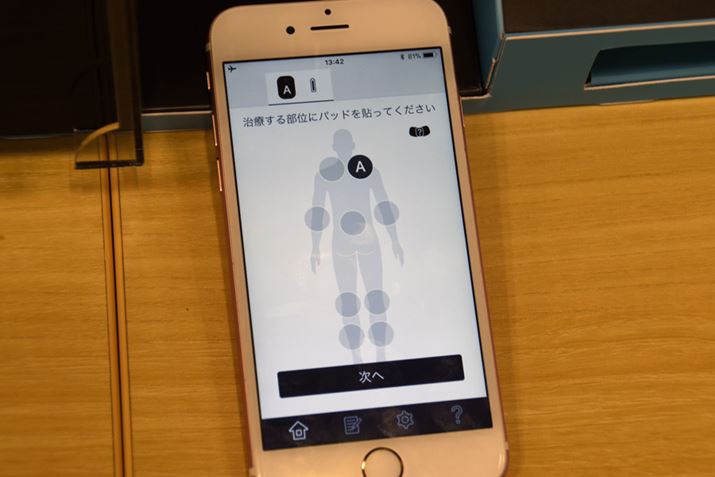 治療したい身体の部位に本体を貼って、アプリでその部位を設定する。2台を別々の部位に装着し、それぞれ貼り付けた部位や症状に合わせたモードを選択することもできる。また、もちろんアプリで設定されていない、てのひらや足の裏といった身体の部位に貼ってもOKだ