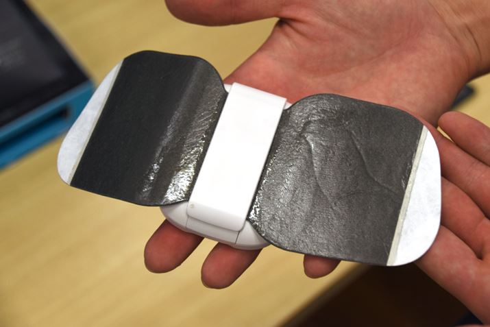 本体の裏側。腰や太ももなどに沿うパッド形状により、大きな筋肉も治療しやすい。なお、本体サイズは、約60(横)×72(縦)×15.5(厚さ)mmで、重量は約42g。パッドのサイズは、約180(横)×79.5(縦)×9.3(厚さ)mmで、重量は約20g