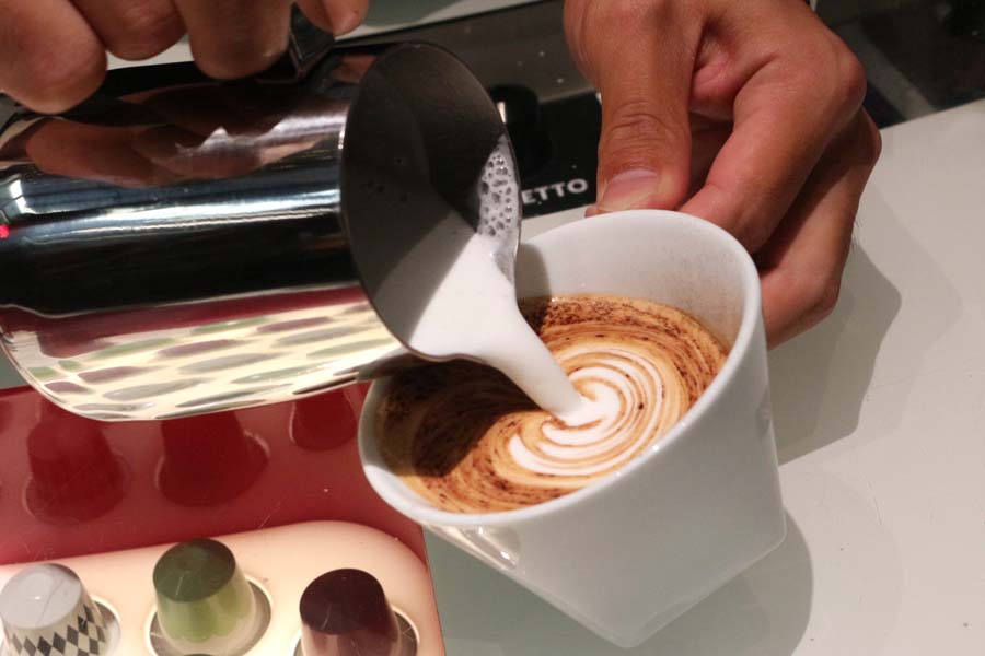 コーヒーが入ったカップに、フォームミルクをゆっくりとそそいでいきます