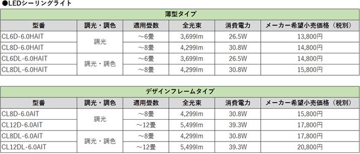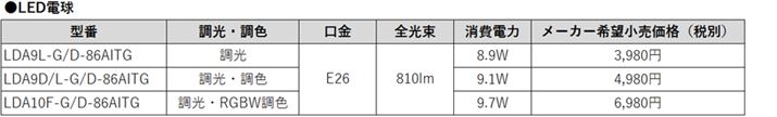 LEDシーリングライトはデザインが異なる2タイプが用意され、どちらも調光のみ、調光・調色が行えるモデルをラインアップ(2018年12月10日発売予定)。LED電球は調光/調光・調色モデルのほか、赤・緑・青・白とその中間色に調色できるモデルも揃えられています(2018年11月30日発売予定)。スペックや価格は下の表で確認してください