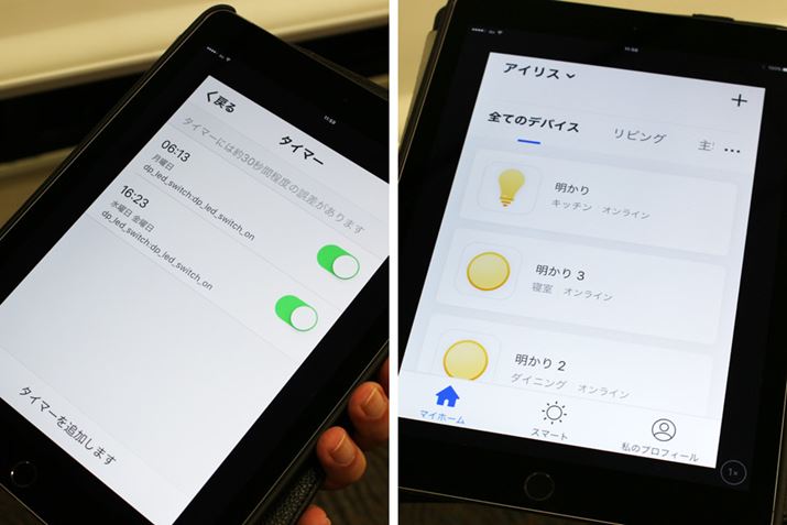 専用アプリを使えば、点灯させるタイミングをタイマーセット可能。ただし、調光や調色をタイマーには設定できないので、消灯する前の明るさや色で点灯します。登録してある照明すべてをアプリで管理できるので、いちいち各部屋に行かなくてもいいのは便利
