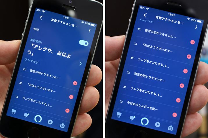 「Amazon Echo」の場合、「Amazon Alexaアプリ」で実行条件(話しかけるワード)に対して行うアクションの中に、LEDシーリングライトやLED電球の点灯や照明を設定します