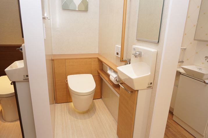 便器とカウンター、手洗い等をパッケージにした「レストパルF」。“F”は便器が床から浮いて掃除しやすいのが特徴です