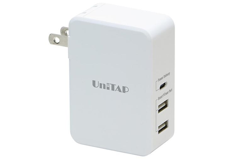 USB PD対応のUSB Type-Cポート1基に加えて、2基のUSB Type-Aポートを備え、同時に3台の充電が行える。USB Type-Cポートは最大出力45W、USB Type-Aポートは2ポートの合計で12Wの出力に対応する。なお、3ポート合計の出力上限は45Wである。こちらの製品もコンセントプラグは折りたたみ可能なスイングプラグで、「Nintendo Switch」でも利用できる。