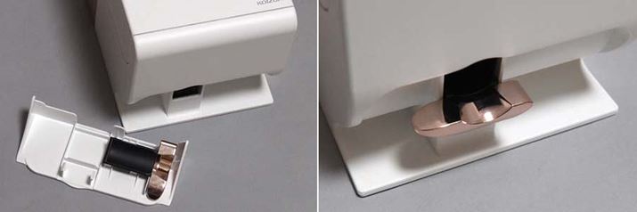 本体正面のフタを外すと、印刷時に指をのせる「フィンガーホルダー」が格納されています。これを本体にセットすれば、本体の準備は完了