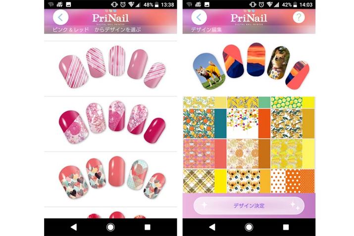 プリネイルは、前述したようにネイル用のプリンター。Wi-Fiでスマートフォンと連携し、専用アプリでデザインを選択するだけで爪に直接印刷ができます。収録されているデザインは、エレガントなものからポップなものまでかなり種類が豊富。そのうえ、デザインを一部変更するといった編集も可能です。