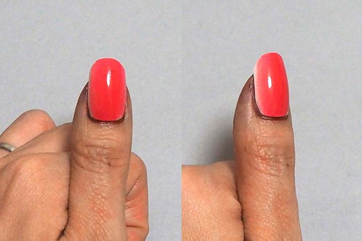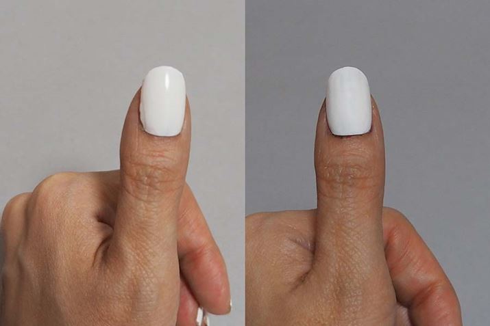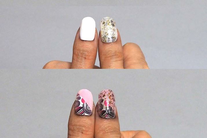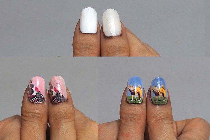 普通の白マニキュア(写真左)とパール系(写真右)のベースで印刷したところ。爪全面に印刷をしても、パールのニュアンスが残っているのがわかります
