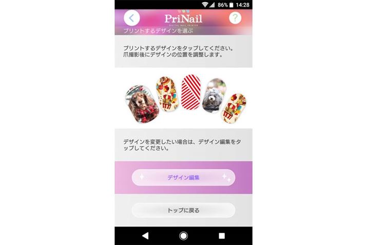 実は、筆者が今回プリネイルを使って1番時間がかかったのがこの「デザイン」部分。指全部を異なるデザインにする場合、慣れていないと「1本1本はカワイイけれど、全体で見るとバランスが悪い」ということもあるのです。プリネイルは編集したデザインを片手(5本分)ごとにまとめて保存できるので、指全体のバランスを見ながらデザインを編集できるのが便利でした。また、デザインはスマホアプリ上でできるので、仕事帰りの電車の中でスマホでデザインを行い、帰宅後印刷するといった効率的な作業ができるのもうれしいポイントです