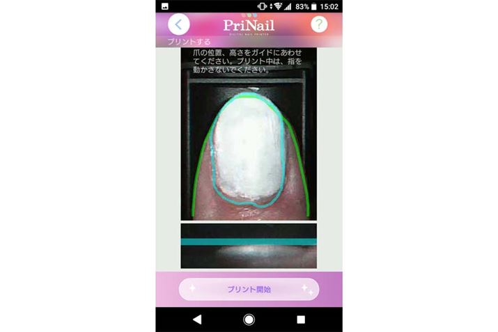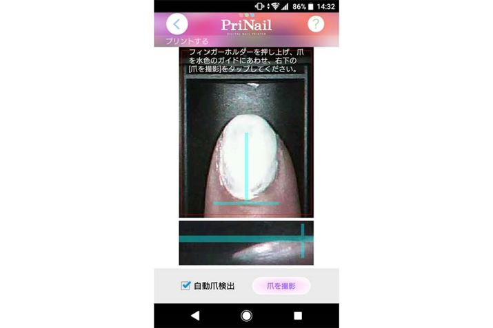 下準備が済んだら、あとはプリネイルのアプリからデザインを選択し、指を本体内のフィンガーホルダーに入れてプリントを開始します。プリネイルは内部カメラで指を撮影し、マニキュアで白く塗った部分を「爪」として自動的に認識。爪の大きさや位置に合わせてデザインの大きさなども自動調整して印刷してくれます。親指と小指ではかなり爪の大きさに違いがありますが、爪ごとに大きさを指定するといった手間もなく、非常に手軽です。