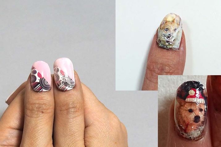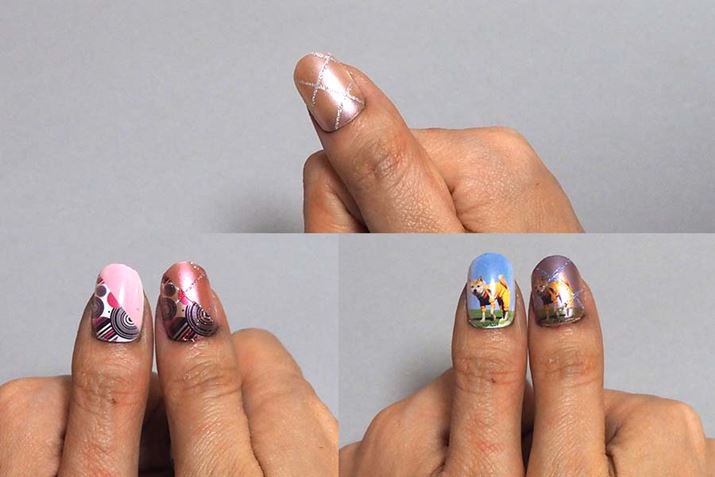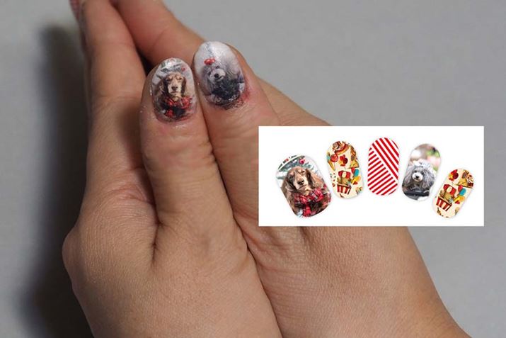 ちなみに、こちらはメタルピンクに銀色のラメで格子柄アートを入れたジェルネイルの上に印刷したもの(上)。印刷後もメタリックな光沢が残っているのがわかります。ただし、ピンクの色が混じるので、幾何学模様(左下)だと意外と違和感はありませんが、犬の写真を使用したほう(右下)は、違和感のある仕上がりに
