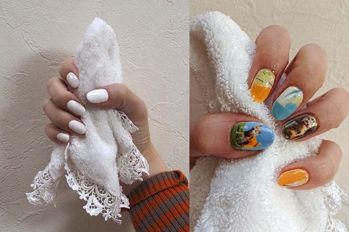 自分で撮影した写真を印刷した直後。右の爪はインクが爪からはみ出ていますが、インクは水性のため、爪全体にトップコートを塗って乾いたあと、はみ出た部分のみウエットティッシュなどで拭くと、トップコートを塗った部分以外は簡単に落とすことができます