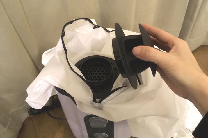 まずは、乾燥機本体に乾燥バッグを取り付け、内側から送風口カバーを通します。このバッグの中が温風で満たされるのですね