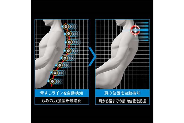 ユーザーの体型を検知するセンシング機能も、「AIダブルセンシング」に進化。「S字ライン検知システム」と「肩位置検知システム」が、従来モデルより正確に背筋のラインと肩の高さを自動検知。取得したデータを「5D-AIメカ」に反映して、最適なマッサージを行います