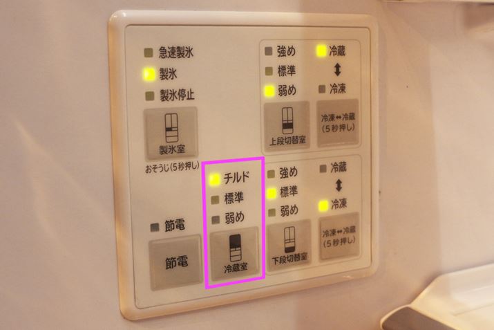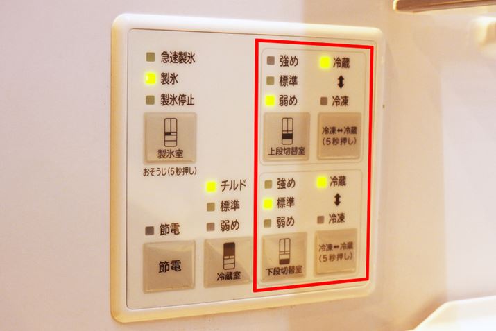 冷蔵室内にある操作パネルで、2段の引き出しをどの温度帯にするか設定。野菜室にしたい場合は、「冷蔵」-「弱め」に設定します