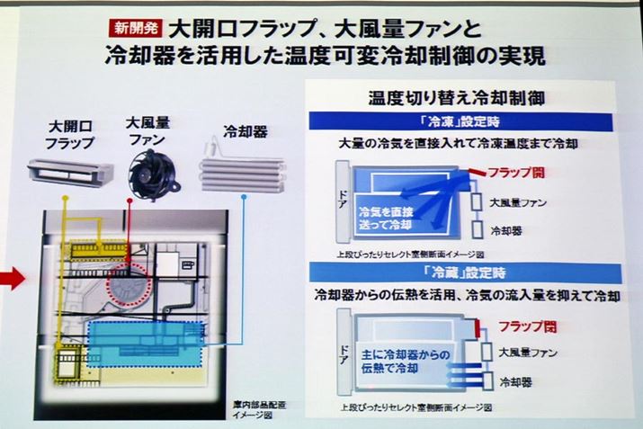 ぴったりセレクト室を冷凍室、冷蔵室、野菜室に適した温度に切り替える仕組みは、フラップとファンの制御で行われます。冷蔵庫は冷却器からの冷気をファンで送り、庫内を冷やしますが、本機は、下の2段の庫内につながる風路にフラップを設置。「冷凍」に設定した場合、フラップを開けて冷気を直接庫内に送って冷却し、「冷蔵」に設定した際には、フラップを閉じて冷却器からの伝熱で冷却します。