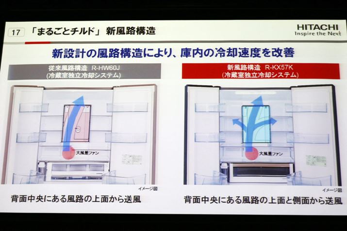 従来は上からしか送風されていなかった風路を側面からも送風できるように改良することで、庫内を約2℃に保てるようになりました