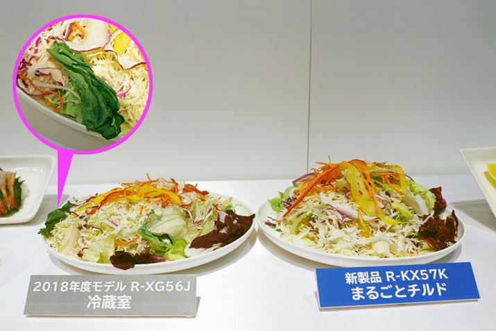 2018年に発売した「HWシリーズ」で採用された「冷蔵室独立冷却システム」は、今回発表したKX/KWシリーズにも継承されています。このシステムは冷却器を冷蔵室用、冷凍室と野菜室用と分けることで、ひとつの冷却器で全室を制御するよりも冷蔵庫の除湿が抑えられ、うるおいが保てるというもの。KX/KWシリーズではシステムの基本的な部分はそのままに、冷気を庫内に届ける風路構造を改良。送風口が増えたことで冷蔵室の温度を約2℃まで下げることができるようになり、チーズなどのチルド食品を保存できるようになりました。冷蔵室の温度(約3〜6℃)よりも低め設定となる、この「まるごとチルド」は菌の繁殖も低減されるため、作り置きした料理の鮮度も長持ちするそうです。