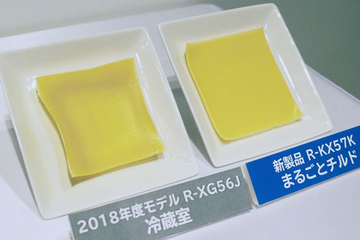 サラダと同じようにテストしたチーズも展示されていました。パッと見ただけで、「まるごとチルド」に入れていないほうのチーズは水分が失われていることがわかります