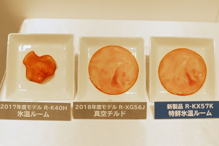 この写真は、全部、約-1℃で3日間保存したハム。保存温度は同じですが、ルーム内に直接冷気を送り込む冷却方法の「氷温ルーム」(左)は乾燥具体が著しい! 特鮮氷温ルーム(右)と真空チルド(中央)はほぼ同じくらいの鮮度をキープしているように見えます