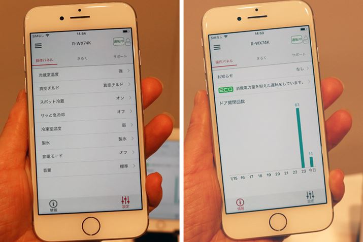 R-X57Kはスマートフォンと連携し、専用アプリで冷蔵室の温度設定などをリモート操作で変更可能。ドアの開閉回数を確認できる項目は、家にいる人の安否を知る目安としても使えそう