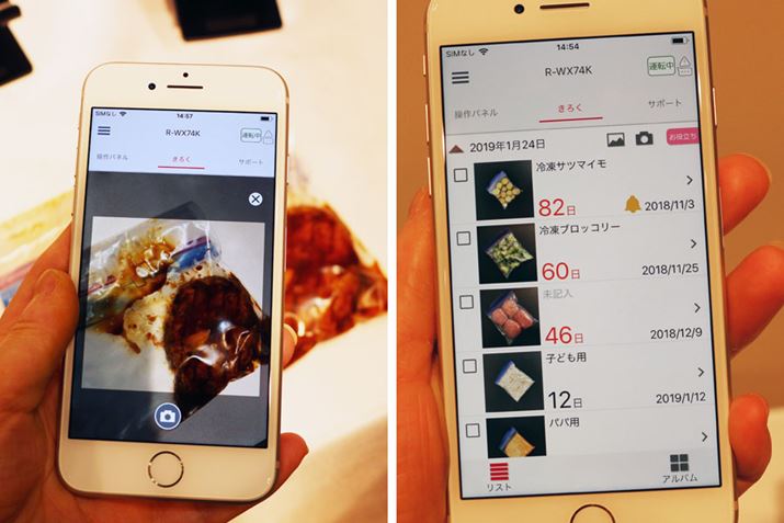 今回登場した新機能「ぴったりセレクト」と「まるごとチルド」を備えた冷蔵庫のラインアップは、「R-KX57K」と「R-KW57K」の2機種。R-X57KにはWi-Fi機能が搭載されており、スマートフォンと連携が可能。専用アプリ(無料)を使えば、冷蔵庫のドアの閉め忘れを通知してもらえるほか、リモート操作、ドアの開閉回数の確認なども行えます。また、冷蔵庫に入れる食材をスマートフォンのカメラで撮影することで、保存してからの経過日数が確認できる食材管理もできるようになりました。