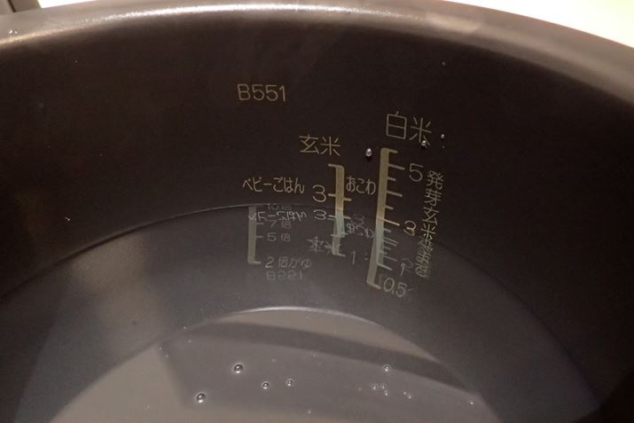 この内釜のすごいところは、米をセットして水を入れると目盛りの色が変化すること。今回は米を入れていませんが、確かに、水のある部分とない部分とでは水位線の色が違います。水位線が見やすくなりました