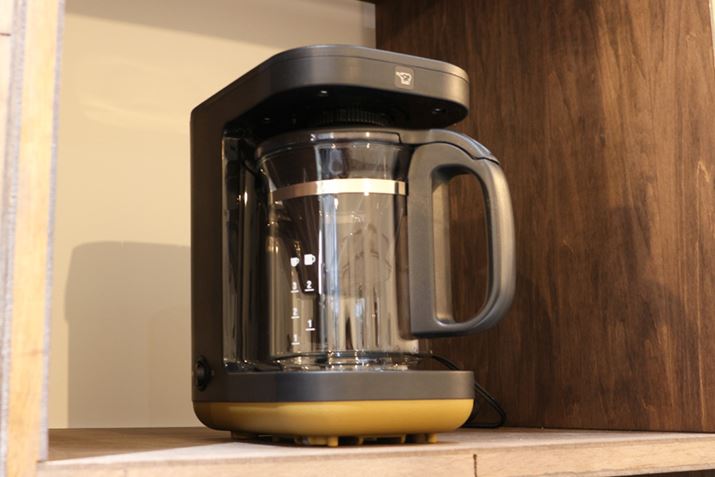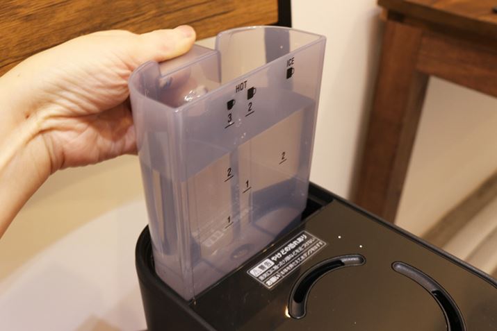 水タンクは取り外しできるので、給水もラクラク。水の量を変えることで、アイスコーヒーも抽出できます(容器に氷を入れて抽出)。本体内にカルキを除去する浄水フィルターも装備しているとのこと