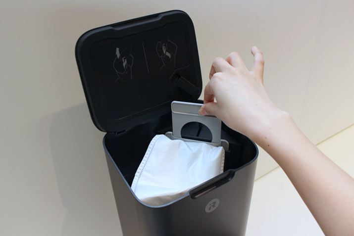 紙パックにゴミがいっぱいになると、アプリに通知が来て、捨てどきを教えてくれます。充電台上部のフタを開けて、紙パックに付いているグレーのツマミを引っ張るだけで簡単に取り外せます。あとはこれをゴミ箱にそのまま捨てればOK。紙パックは、3つセットで1,000〜2,000円くらいで販売予定とのこと