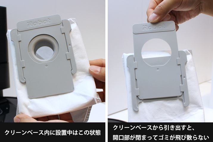 また、溜まったゴミは紙パックごと捨てられるので、手を汚すことがなく、ホコリが舞い散ることもありません。つまり、一般的にロボット掃除機を使う場合のネックのひとつだった「ゴミ捨て」を、極力行わなくていいようにしているのです。なお、こういった充電台のダストステーションに一定期間ゴミを溜めておけるロボット掃除機は以前にもありましたが、i7+は紙パック式を採用しているため、最後のゴミ捨てが簡単に行える点は大きなアドバンテージと言えるでしょう。