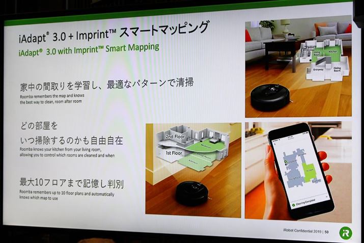 そこで肝となるのは、独自の高速応答プロセス「iAdapt」。i7には、その最新版である「iAdapt 3.0 ビジュアルローカリゼーション」が搭載されました。このiAdapt 3.0と新しい高速処理プロセッサーを採用することにより、「Imprintスマートマッピング」という新機能を実現したのが大きなポイント。これはなんと、「リビング」「子ども部屋」といった「家全体の間取り」までルンバが認識するという機能です。