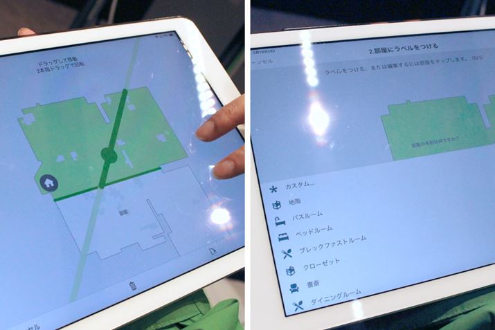 「トレーニング清掃」が終わると、アプリに家の外枠が表示されます。タッチ操作で細かく間取りを設定し、各部屋に「リビング」「子ども部屋」などの名前を登録しておくと、その情報が自動でi7に共有されます。これで、i7が部屋を個別で認識できるようになります