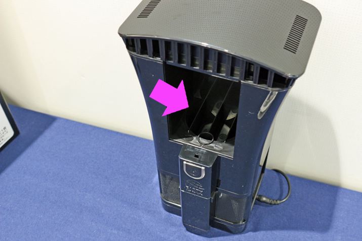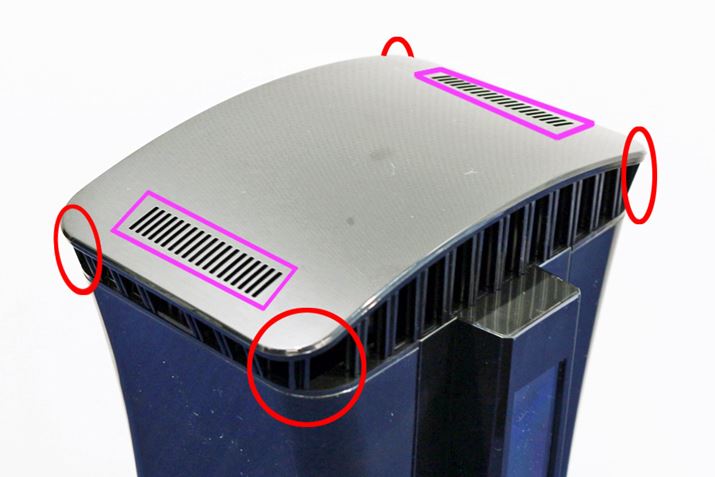 本体天面にある吹出口(ピンクの囲み部分)から、二酸化炭素と誘引剤の香りが放出。蚊を捕らえる吸込口は四隅(赤い囲み部分)にありますが、放出された二酸化炭素や誘引剤の香りが本体内に吸い込まれないように工夫しているといいます