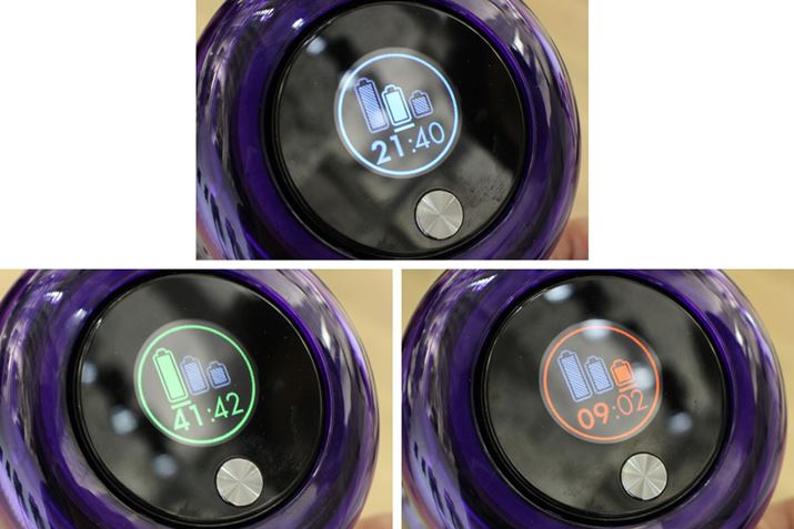 写真のように「37:02」といった感じで具体的な残り時間を表示してくれます。内蔵のシステムモニタリング機能と高度センサーが毎秒4回バッテリー容量を計測して、本体とヘッドの出力を最適化する設計。使用頻度にあわせてユーザーの使用傾向を学習する機能も搭載されており、使用を継続することで残量表示の精度も向上するそう