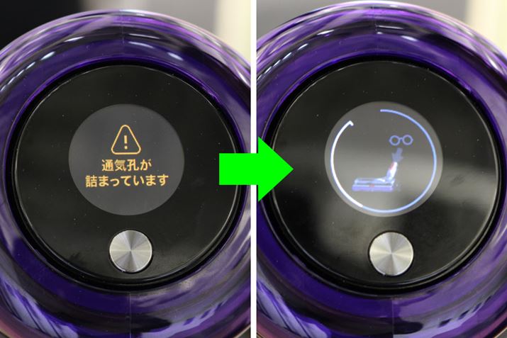 残りの運転時間だけではなく、通気孔が詰まっていたり、フィルターがきちんと閉まっていないような場合も、この液晶ディスプレイで確認個所をアニメーションで表示してくれます