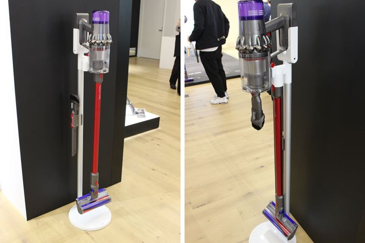 V11シリーズの中で、「V11 absolute」と「V11 fluffy+」には、自立式の専用充電スタンドが同梱されることにも注目。自立式なので壁に固定しなくてもよいうえ、付属ツールもまとめて収納することができて便利です。なお、スタンダードモデルのV11 Fluffyにはこの充電スタンドが付属せず、従来と同じ壁掛け型の充電システムとなります。製品選びの際には、このあたりも含めてポイントになりますね。