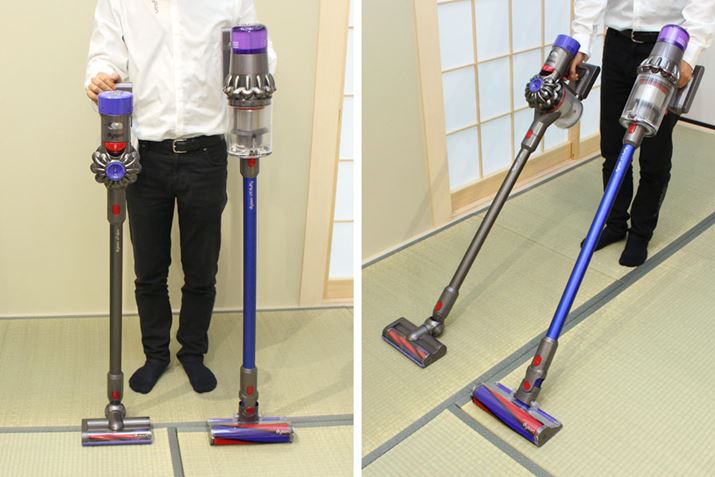 同時発表されたV11(ダイソン掃除機のスタンダードなサイズ)と比べてみると、そのコンパクトさがわかりやすいです