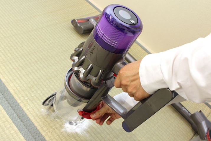 ダストカップの構造はV10を継承。赤いレバーを下におろすことで、ゴミ箱の中に向かってまっすぐにゴミを排出できるようになっています