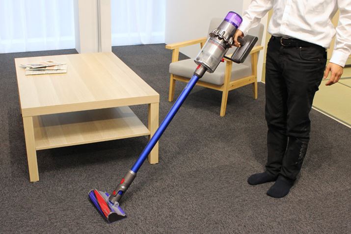 というわけで最後に、V7 Slimで掃除をしている様子をご覧ください。ダイソンのコード付きキャニスター掃除機と比べても遜色ないパワーを発揮しています。