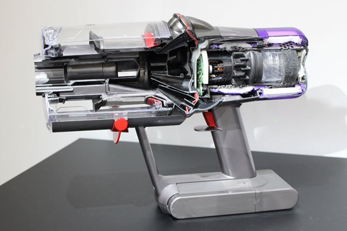 このディフューザーで、モーターから出てくる空気の流れを整えて吸引力を向上させつつ、さらに騒音まで抑える設計になっているのが特徴です。また、インペラーの設計も改良してより効率よくゴミを吸い込めるようにしました。同社の発表によれば、そのおかげでV10よりも吸引力が25%アップし、同時に運転音が11%静かになっているとのことです。