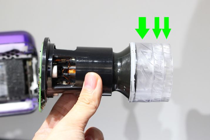 こちらがV11のモーター部。前2つの薄いディフューザーがモーターから出る空気の流れを整える役目を担い、乱気流を低減することで吸引力を向上させています。さらに、残りひとつのディフューザーで騒音を低減し、音響を改善する構造