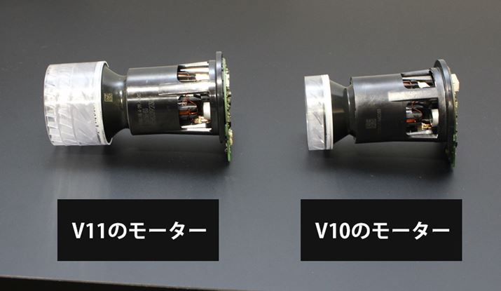 V10のモーターと比較すると、新しくなったディフューザーの分だけ大型化しているのがわかります。それもあって、V11本体の重量はV10より160g増加していますが、このあたりは性能のために割り切っているよう