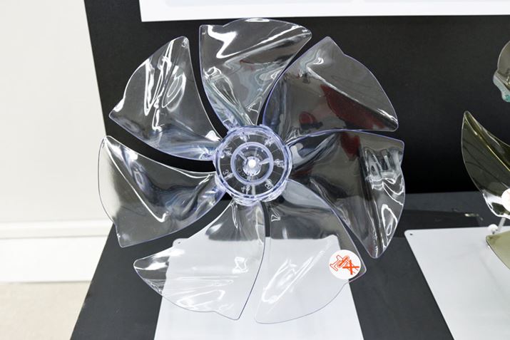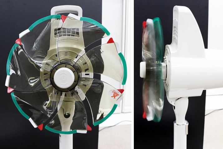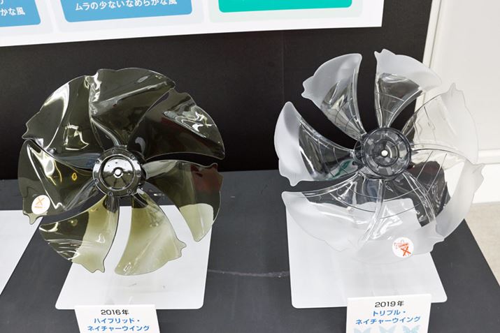 上位モデル「PJ-J3DG」に搭載される「トリプル・ネイチャーウイング」は7枚羽根ですが、回転すると、羽根のくびれと尾状の突起で3重の軌跡が描かれます(右)。これにより21枚羽根相当のなめらかな風が放出されるのだそう