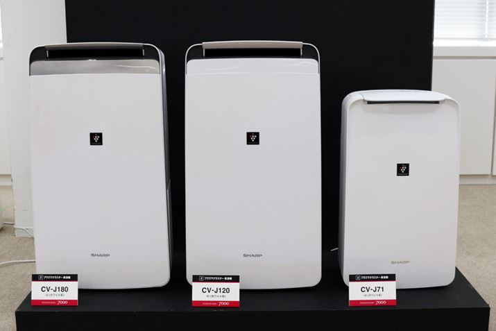 除湿機の2019年モデルは、先日紹介した冷風機能付きタイプ「コンパクトクール CM-J100」のほか、除湿能力18L/日の「CV-J180」と12L/日の「CV-J120」、7.1L/日の「CV-J71」がラインアップ。いずれもコンプレッサー式でプラズマクラスター7000を搭載しています。