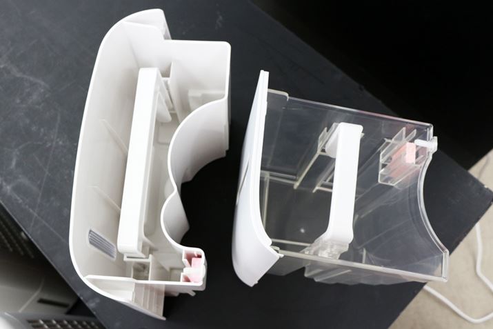 前モデル(左)と新モデル(右)の排水タンクの形状。新モデルのほうは手を入れられるくらい広くなったので、お手入れがしやすくなりました