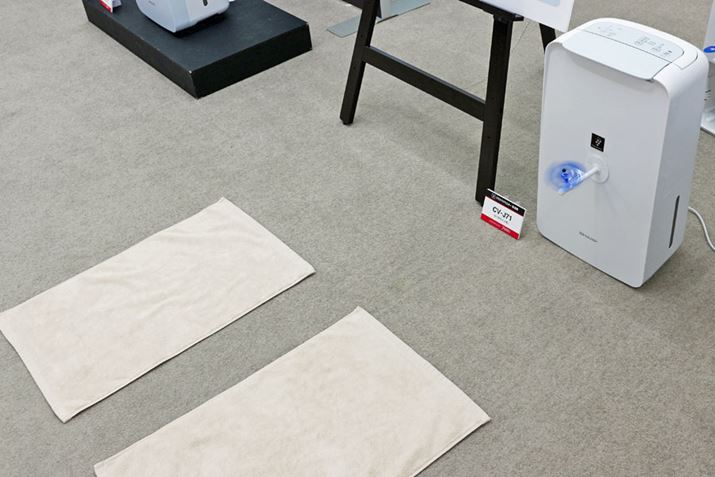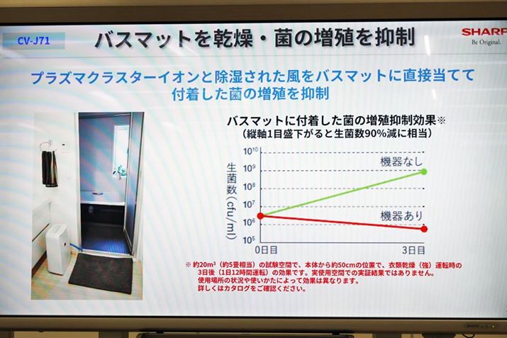 この中でリニューアルされたのは、A4サイズのスペースに設置できるコンパクトサイズながらワンランク上の除湿能力を備えたCV-J71です。排水タンクの形状を手入れしやすい構造に改良するとともに、前モデルのユーザーからの希望で多かった連続排水にも対応。さらに、下向き約45°に送風できるようにすることで、プラズマクラスターイオンと除湿した風により、バスマットなどに付着した菌の増殖を抑えられるようになりました。