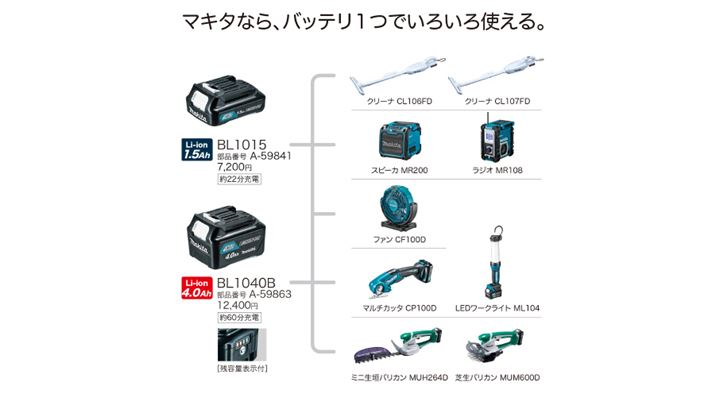 多くのマキタ製品でバッテリーパックの規格を共有していて、「さっきまでモーターを回していたバッテリーでいざというときにはスマホを充電」なんてことも可能(画像はメーカー公式サイトより)