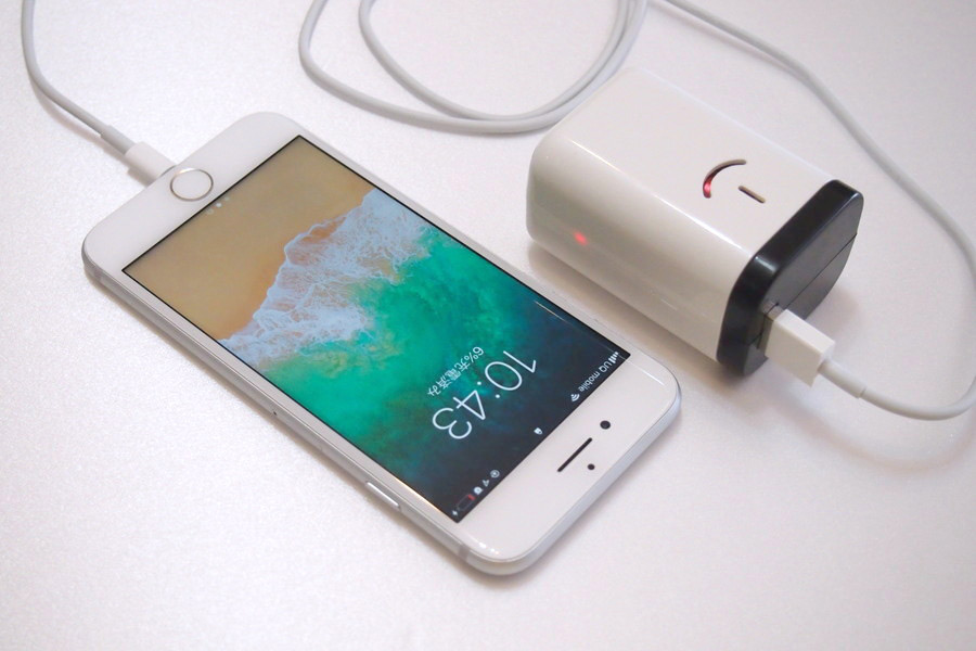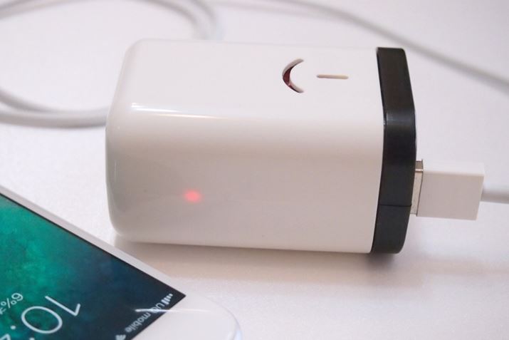 本製品にケーブルを介してiPhone 7をつないだところ。このようにケーブルをつなぐだけで充電が始まります
